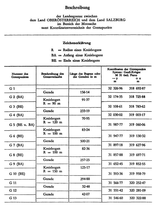 Die Landesgrenze zwischen dem Land Oberösterreich und dem Land Salzburg ist im Bereich der oberösterreichischen Gemeinde St. Pantaleon (politischer Bezirk Braunau am Inn) und der salzburgischen Gemeinde St. Georgen bei Salzburg (politischer Bezirk Salzburg-Umgebung) zwischen den Grenzpunkten G 1 und G 13 durch die in der Beschreibung ( Anlage 1 ) und im Plan im Maßstab 1:2000 ( Anlage 2 ) dargestellte Mittellinie der Moosache ohne Rücksicht auf spätere Veränderungen dieser Mittellinie bestimmt.