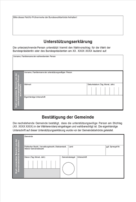 (2) Die Unterstützungserklärung hat die Bestätigung der Gemeinde zu enthalten, dass die in der Erklärung genannte Person am Stichtag in der Wählerevidenz eingetragen und wahlberechtigt (§ 21 Abs. 1 NRWO) war. Diese Bestätigung ist von der Gemeinde nur dann zu erteilen, wenn die in der Erklärung genannte Person vor der am Stichtag zur Führung der Wählerevidenz zuständigen Gemeindebehörde persönlich erscheint, ihre Identität durch ein mit Lichtbild ausgestattetes Identitätsdokument (zB Personalausweise, Pässe und Führerscheine) nachgewiesen hat, die Unterstützungserklärung die Angaben über Vornamen, Familiennamen, Geburtsdatum und Wohnort sowie den Namen des zu unterstützenden Wahlwerbers enthält und die eigenhändige Unterschrift der die Unterstützungserklärung abgebenden Person vor der Gemeindebehörde geleistet wurde. Die Gemeinden sind verpflichtet, Unterstützungswilligen Drucksorten nach Muster der Anlage 1 ohne Einhebung von Verwaltungsabgaben, sonstigen Abgaben und Gebühren zur Verfügung zu stellen; hierbei haben sie ihnen allenfalls zur Verfügung stehende, auf den vom Unterstützungswilligen bezeichneten Wahlwerber lautende Drucksorten zu verwenden. Die Bestätigung auf einer Unterstützungserklärung ist unverzüglich auszufertigen.