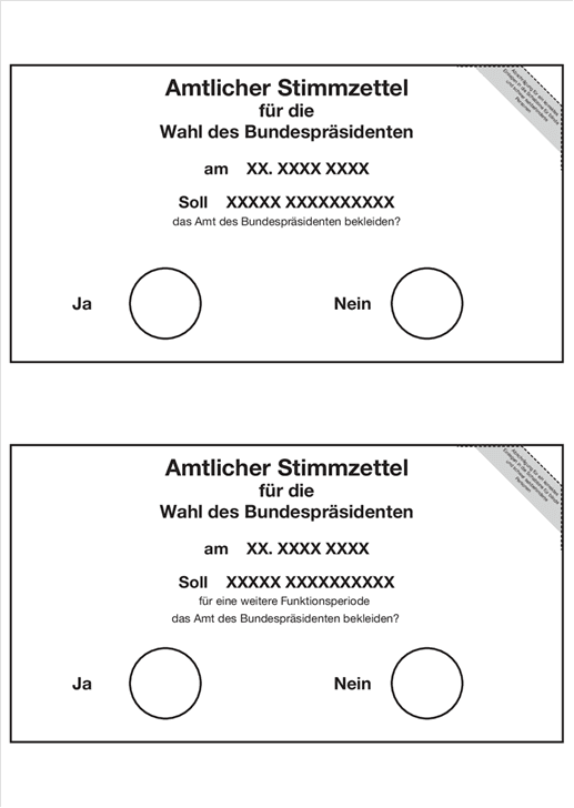 (4) Stellt die Bundeswahlbehörde am einunddreißigsten Tag vor dem Wahltag fest, daß sich nur ein Wahlwerber um das Amt des Bundespräsidenten bewirbt, so hat der amtliche Stimmzettel die Fragen „Soll NN das Amt des Bundespräsidenten bekleiden?“ oder „Soll NN für eine weitere Funktionsperiode das Amt des Bundespräsidenten bekleiden?“ und darunter die Worte „ja“ und „nein“, jedes mit einem Kreis, im übrigen aber die aus dem Muster der Anlage 3 ersichtlichen Angaben zu enthalten.