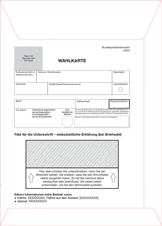 (6) Die Wahlkarte und die Wahlkarte für den zweiten Wahlgang sind jeweils als verschließbarer Briefumschlag herzustellen. Die Wahlkarte hat die in der Anlage 4 ersichtlichen Aufdrucke, die Wahlkarte für den zweiten Wahlgang hat die in der Anlage 5 ersichtlichen Aufdrucke aufzuweisen, darunter einen Barcode oder QR-Code, der einen bei einer Wahl sich nicht wiederholenden und auf der Wahlkarte aufzudruckenden Zahlencode zu enthalten hat. Wahlkarten, die mittels automationsunterstützter Datenverarbeitung ausgestellt werden, können anstelle der Unterschrift des Bürgermeisters mit einer Amtssignatur gemäß §§ 19 und 20 des Bundesgesetzes über Regelungen zur Erleichterung des elektronischen Verkehrs mit öffentlichen Stellen (E Government-Gesetz – E-GovG), BGBl. I Nr. 10/2004, versehen werden, wobei § 19 Abs. 3 zweiter Satz E-GovG nicht anzuwenden ist. Die Wahlkarten-Formulare sowie die Wahlkarten Schablonen (Abs. 7) sind den für die Ausstellung der Wahlkarten zuständigen Behörden aufgrund einer regelmäßig durchzuführenden Bedarfserhebung in ausreichendem Maß zur Verfügung zu stellen.