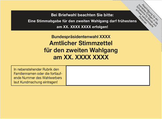 (2) Für einen allfälligen zweiten Wahlgang gilt Abs. 1 mit der Maßgabe, dass beige-farbene Wahlkuverts zu verwenden sind.