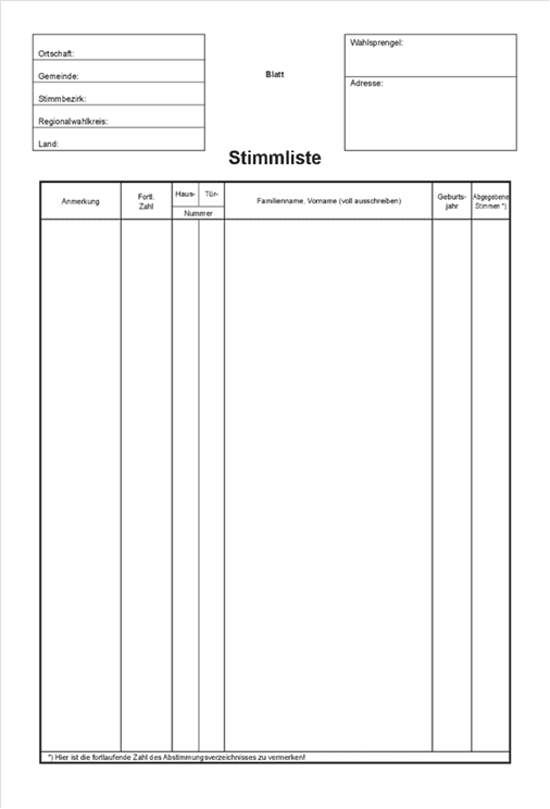 (3) Die Stimmlisten werden mit Hilfe des Zentralen Wählerregisters – ZeWaeR (§ 4 Abs. 1 WEviG) oder in einer lokalen Datenverarbeitung durch Import der Daten aus einer hierfür zur Verfügung gestellten Schnittstelle des ZeWaeR erstellt und gegebenenfalls richtiggestellt oder in Papierform erstellt. Für Stimmlisten in Papierform ist das Muster in Anlage 1 zu verwenden. Bei elektronisch erstellten Wählerverzeichnissen hat der Aufbau der Ausdrucke diesem Muster zu entsprechen.