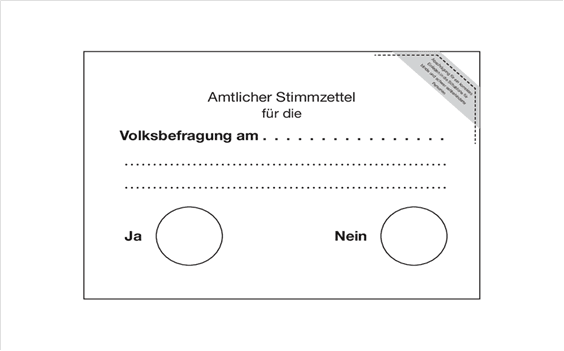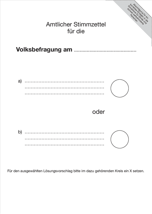 (2) Der amtliche Stimmzettel hat bei Fragestellung mit „ja“ oder „nein“ links unter der Frage das Wort „ja“ und daneben einen Kreis, rechts unter der Frage hingegen das Wort „nein“ und daneben einen Kreis zu enthalten (Muster Anlage 2). Bei Vorlage zweier alternativer Lösungsvorschläge ist auf dem Stimmzettel neben dem Lösungsvorschlag „a“ und dem Lösungsvorschlag „b“ ein Kreis zu setzen (Muster Anlage 3).