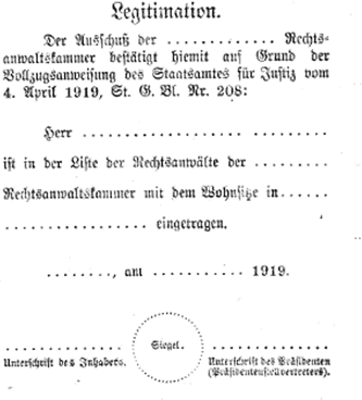 Die Legitimation ist vom Ausschusse der zuständigen Rechtsanwaltskammer nach untenstehendem Formulare auszustellen und von dem Präsidenten oder einem Präsidentenstellvertreter zu unterfertigen. Sie muß den Namen und den Wohnsitz des Rechtsanwaltes enthalten und mit dem Lichtbilde und der eigenhändigen Unterschrift des Rechtsanwaltes versehen sein.