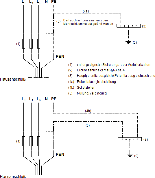 Für die Anordnung und Dimensionierung der Nullungsverbindung (5) bestehen je nach den örtlichen Verhältnissen einer Anlage grundsätzlich mehrere Möglichkeiten. Die Querschnittsdimensionierung hat gemäß § 6 Abs. 8 zu erfolgen. Beispielhaft wird in den tieferstehenden Prinzipschaltbildern dargestellt, wie der Anschluß des PEN-Leiters an den PE-Leiter bzw. an den Hauptpotentialausgleich vorzugsweise erfolgen kann.