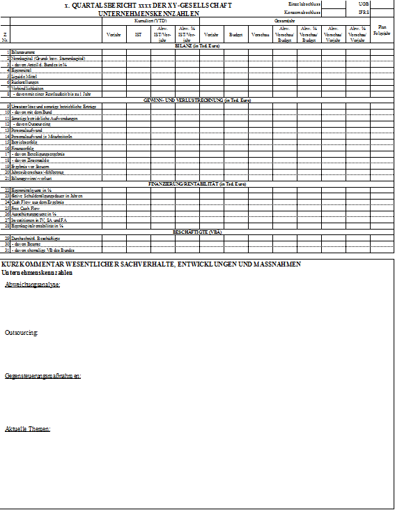 (5) Die Berichte haben neben den zahlenmäßigen Darstellungen eine Kurzkommentierung wesentlicher Abweichungen zu enthalten. Wesentlich sind unterjährige Abweichungen (Quartalsvergleich) des IST-Wertes von mehr als 5% im Vergleich zum quartalsweisen Ansatz des Vorjahres und Abweichungen von mehr als 5% der aktuellen Vorschau zum Budgetansatz und im Vergleich zum Vorjahr (Gesamtjahresvergleich). Im Kurzkommentar sind neben der Abweichungsanalyse Angaben zu erforderlichenfalls eingeleiteten Gegensteuerungsmaßnahmen, ausgelagerten Fremdleistungen (Outsourcing) und aktuellen Themen zu machen und ist die weitere Entwicklung (aktuelle Vorschau) zu erläutern.