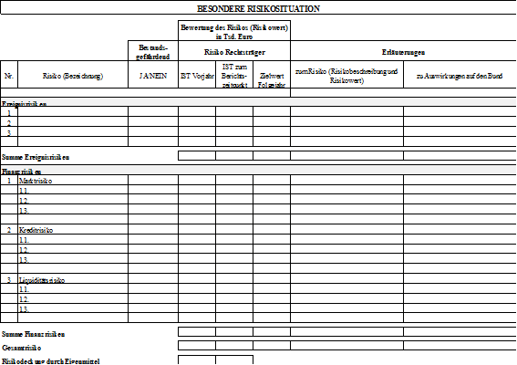 Die konkreten Risiken sind Risikokategorien zuzuordnen, zu bewerten und der Risikowert anzugeben. Die Erläuterungen zum Risikowert enthalten zusätzliche verbale und ggf. auch betragsmäßige Angaben über die einzelnen Risiken, wobei das Risiko jedenfalls kurz zu beschreiben ist. Für den Rechtsträger zum Berichtsstichtag hinsichtlich ihrer Höhe wesentliche Risikowerte sind zu erläutern. Im Falle von für den Rechtsträger wesentlichen Änderungen des Gesamtrisikos im Vergleich des IST zum Berichtszeitpunkt mit dem IST Vorjahr sind diese Änderungen ebenfalls zu erläutern. Zusätzlich zum Risikowert sind auch etwaige Auswirkungen auf den Bund zu erläutern. Auswirkungen auf den Bund liegen immer dann vor, wenn durch die Geschäftstätigkeit des Rechtsträgers Risiken entstehen, die sich im Falle des Schlagendwerdens auf den Bund alleine oder auf den Bund und den Rechtsträger selbst auswirken.
