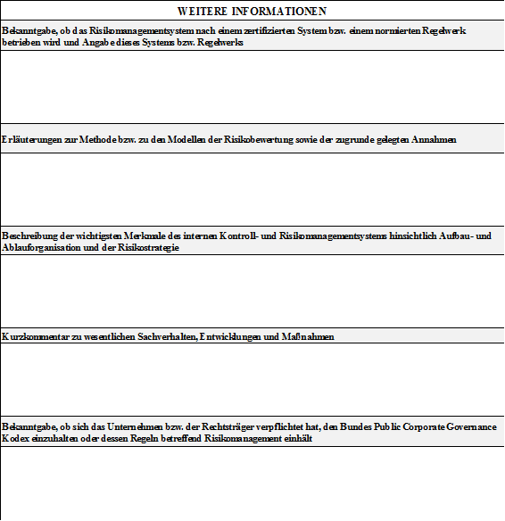 Kurzkommentar zu wesentlichen Sachverhalten, Entwicklungen und Maßnahmen: Es ist insbesondere die Entwicklung der Risikolage darzustellen sowie über wesentliche Sachverhalte und Maßnahmen des Risikomanagements (beispielsweise Risikoidentifikation, Risikovermeidung bzw. –verminderung) zu berichten.