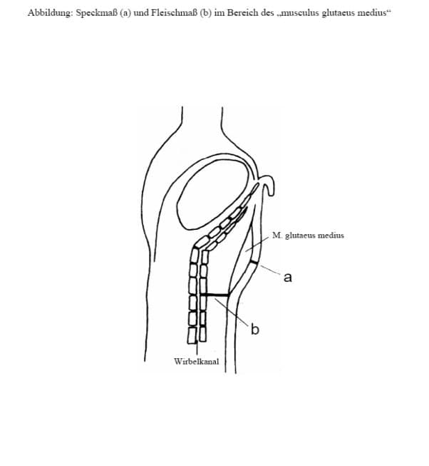 (3) Das Speckmaß a ist – wie im Anhang dargestellt – die Speckdicke (einschließlich Schwarte) in Millimeter, gemessen auf der Spaltfläche des Schlachtkörpers an der dünnsten Stelle über dem Musculus glutaeus medius.