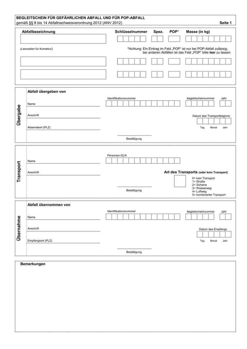 (1a) Handelt es sich bei dem gefährlichen oder nicht gefährlichen Abfall um einen POP-Abfall gemäß § 2 Abs. 4 Z 9 AWG 2002, so ist bekannt zu geben, dass es sich um einen POP-Abfall handelt; Falls auf der Begleitscheinvorlage dafür kein gesondertes Feld („POP“) vorgesehen ist, ist die Zeichenfolge „#POP#“ am Anfang des Bemerkungsfeldes anzugeben.