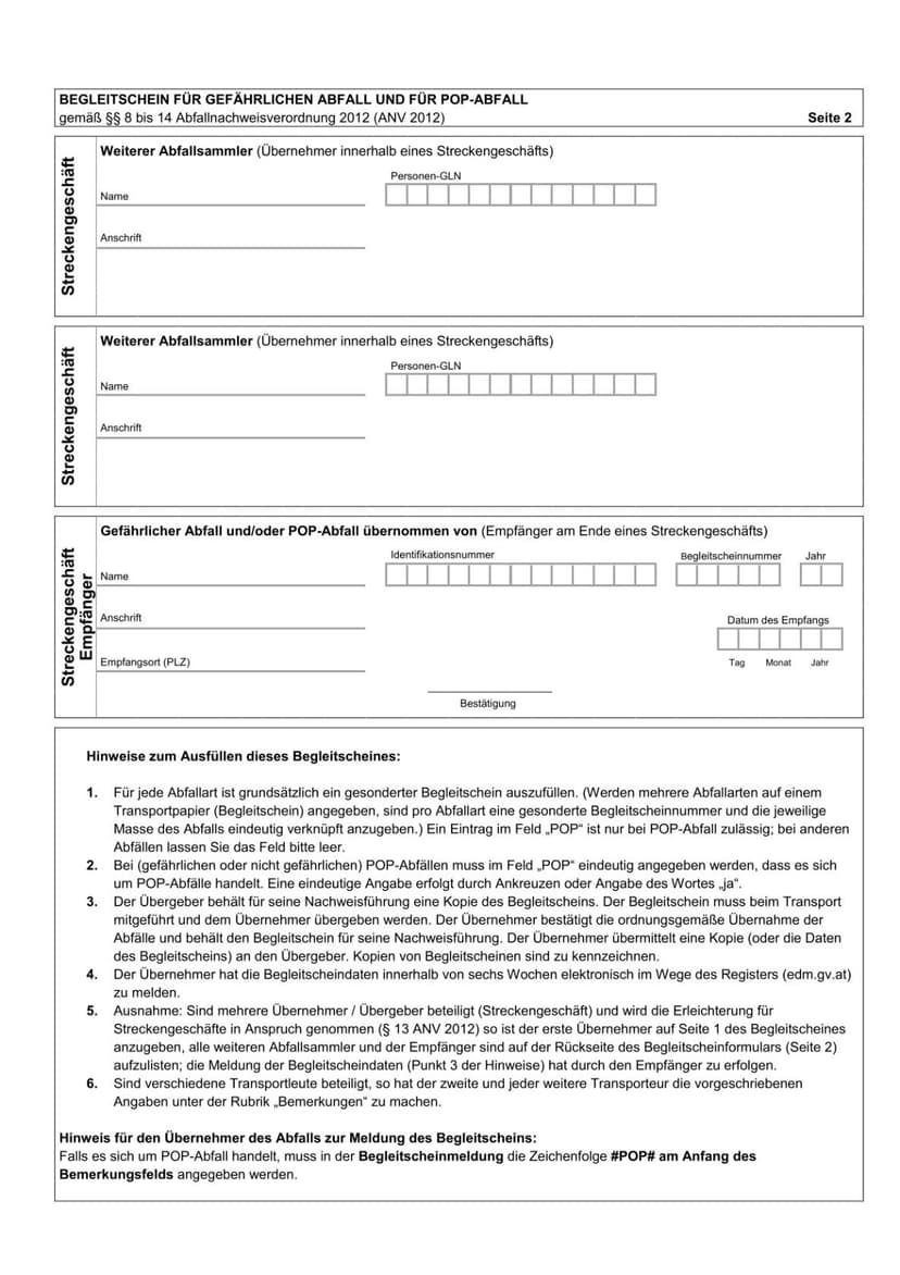 2. eine Kopie des Begleitscheins oder die Daten des Begleitscheins gemäß den §§ 9 bis 11 innerhalb von vier Wochen nach Ablauf des Monats, in dem die Übernahme der Abfälle erfolgte, an den Übergeber zu übermitteln;