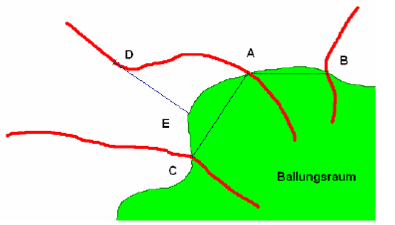 hauptdokument.img1is.pngPNG Vom Punkt A, an welchem die Hauptverkehrsstraße, Eisenbahnstrecke oder Straßenbahnstrecke die Grenze zum Ballungsraum überschreitet, werden nach beiden Seiten die Schnittpunkte B und C der benachbarten Hauptverkehrsträger mit den Ballungsraumgrenzen gesucht. Die größere der beiden Strecken