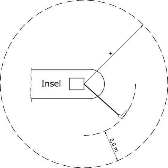 9. Wirkbereich ist der mit dem Zapfventil in einer Arbeitshöhe von ca. 0,8 m horizontal betriebsmäßig erreichbare Bereich zuzüglich 2 m. Der Wirkbereich entspricht dem Abstand x in der Abbildung gemäß Anhang 1;