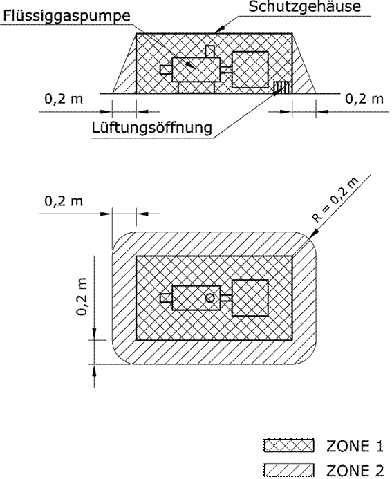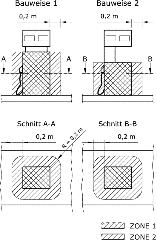 (1) Der gesamte Bereich innerhalb des Schutzgehäuses der Flüssiggas-Zapfsäule, in dem sich Bauteile befinden, die Flüssiggas führen, ist explosionsgefährdet und gilt als Zone 1. Der explosionsgefährdete Bereich außerhalb der Flüssiggas-Zapfsäule erstreckt sich, sofern vom Hersteller nicht anders festgelegt, bis zu einem Abstand von 0,2 m um das Schutzgehäuse von der Schutzgehäuseoberkante bis zum Erdboden; er ist der Zone 2 zuzurechnen. Diese beiden Zonen sind im Anhang 2 durch zwei Beispiele dargestellt.