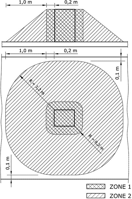 (2) Der explosionsgefährdete Bereich des Flüssiggas-Zapfgerätes erstreckt sich bis zu einem Abstand von 0,2 m um die Konturen des Flüssiggas-Zapfgerätes von der Oberkante bis zum Erdboden und gilt als Zone 1. Der explosionsgefährdete Bereich der Zone 2 erstreckt sich über den Innenraum eines Kegels um die Zone 1, wobei sich die Spitze des Kegels entlang der Oberkante der Zone 1 erstreckt und sich die Basis am Erdboden im Abstand von 1 m von der Zone 1 ergibt. Diese beiden Zonen sind im Anhang 3 dargestellt.