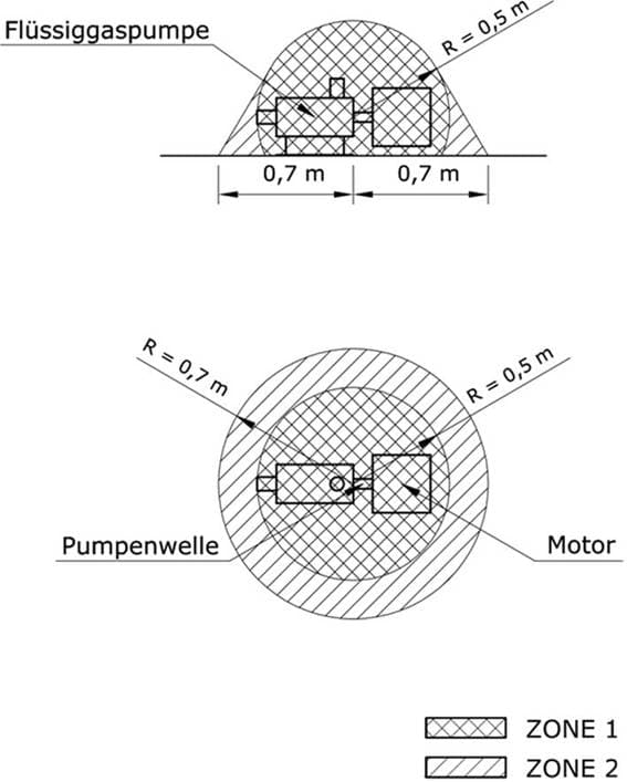 3. Sofern vom Hersteller nicht anders festgelegt, ist bei Flüssiggaspumpen mit geringer Förderleistung (bis höchstens 60 l/min) um nicht dauerhaft technisch dichte Verbindungen (wie beispielsweise Wellendurchführungen mit Gleitringdichtungen oder Stopfbüchsen) und um sonstige Flüssiggasaustrittsstellen ein kugelförmiger explosionsgefährdeter Bereich mit einem Radius von mindestens 0,5 m als Zone 1 und ein daran anschließender Kegel mit einem Radius des Basiskreises von mindestens 0,7 m als Zone 2 anzunehmen (siehe Abbildung in Anhang 4). Für in sich geschlossene Flüssiggaspumpen-Systeme (wie beispielsweise Flüssiggaspumpen mit Magnetkupplung) mit geringer Förderleistung entfällt der explosionsgefährdete Bereich.
