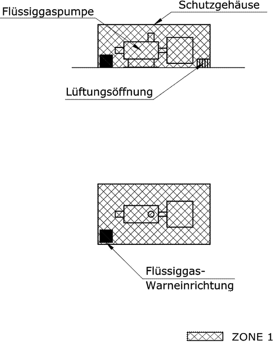 2. Wird innerhalb des Schutzgehäuses der Flüssiggaspumpe eine Flüssiggaswarneinrichtung in Verbindung mit einem Not-Aus-System installiert, so gilt der Bereich innerhalb des Schutzgehäuses als Zone 1 (siehe Abbildung in Anhang 6). Flüssiggaswarneinrichtungen müssen § 18 Abs. 5 entsprechen.