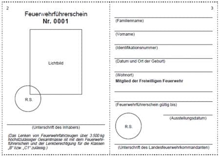 Der Feuerwehrführerschein hat nach Form und Inhalt dem Muster der Anlage zu entsprechen und hat die jeweilige Landesbezeichnung des Bundeslandes, in dem der Feuerwehrführerschein ausgestellt wird, zu enthalten. Die Farbe des Feuerwehrführerscheines ist rot.