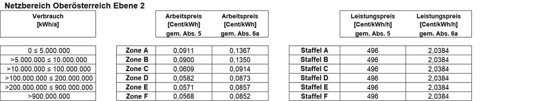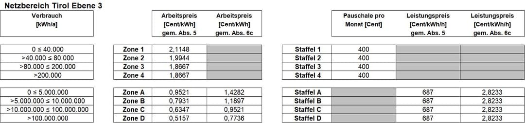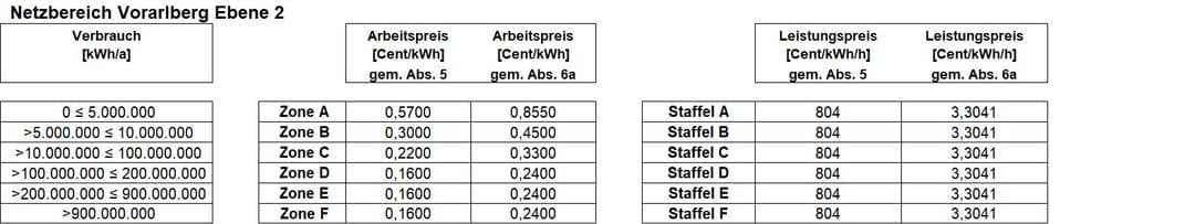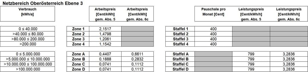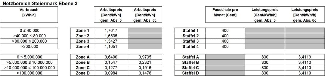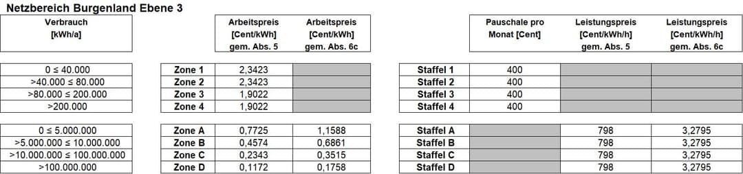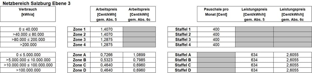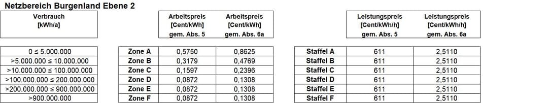 (4) Die Entgelte werden verbrauchs- und leistungsabhängig in Zonen bzw. Staffeln festgelegt. Die Zonen 1-4 sowie die Staffeln 1-4 kommen für nicht leistungsgemessene Anlagen, die Zonen A-F sowie die Staffeln A-F kommen für leistungsgemessene Anlagen zur Anwendung. Der Arbeitspreis wird für die Zonen 1-4 bzw. A-F so festgelegt, dass je nach Jahresverbrauch alle darunter liegenden Zonen durchlaufen werden. Der Leistungspreis wird in den Staffeln A-F bzw. 1-4 festgelegt, wobei der Leistungspreis der Staffel 1-4 als Pauschale bestimmt wird. Die Pauschalen der Staffeln 1-4 sind grundsätzlich auf einen Zeitraum von einem Monat zu beziehen. Ist der Abrechnungszeitraum kürzer oder länger als ein Monat, sind die Pauschalen der Staffeln 1-4 tageweise zu aliquotieren. Es können Zonen bzw. Staffeln zusammengefasst werden, sodass mehrere Zonen bzw. Staffeln denselben Arbeitspreis bzw. denselben Leistungspreis aufweisen können. Die Rechnungslegung hat entsprechend den tatsächlichen Ableseintervallen (§ 15 Abs. 3) zu erfolgen, § 126 Abs. 2 GWG 2011 bleibt davon unberührt.