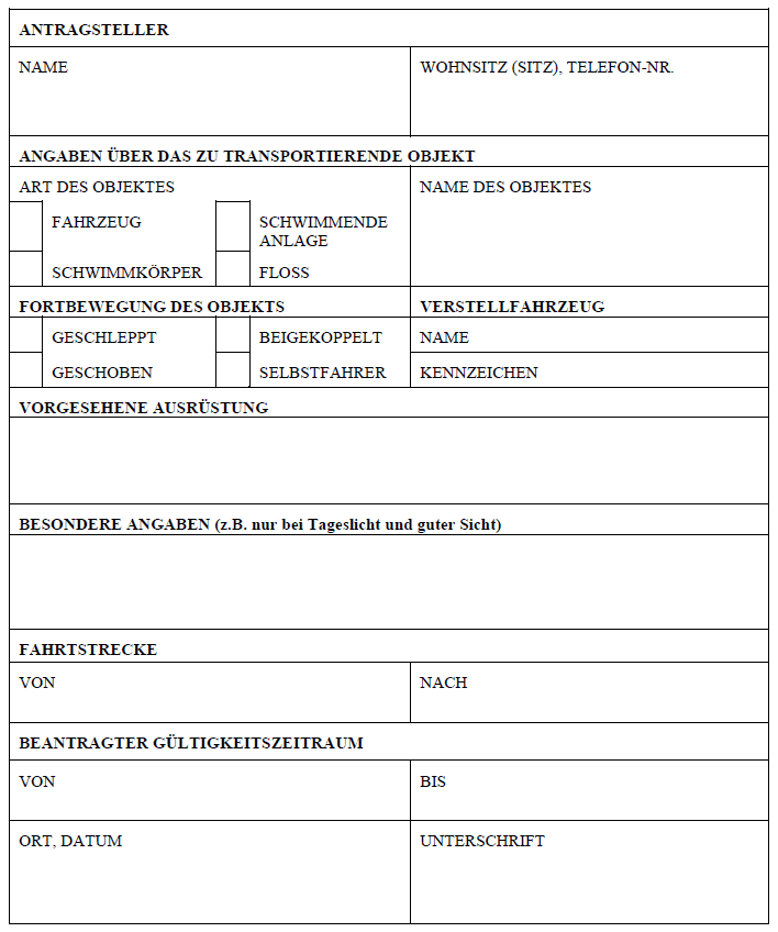 Länge, Breite, Höhe, Tiefgang und Geschwindigkeit der Fahrzeuge, Verbände und Schwimmkörper müssen den Gegebenheiten der Wasserstraße und ihrer Anlagen angepasst sein. In Österreich haben Fahrzeuge, die auf Grund ihres Tiefgangs nicht die gesamte gekennzeichnete Fahrwasserbreite nutzen können, die durch Binnenschifffahrtsinformationsdienste auf www.doris.bmk.gv.at bekannt gegebenen Fahrwassertiefen im Rahmen der allgemeinen Sorgfaltspflicht und insbesondere bei der Planung und Kommunikation des Begegnens und Überholens zu berücksichtigen.