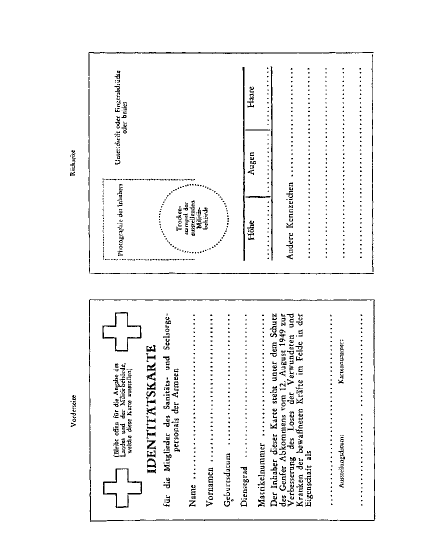 Die militärischen Identitätsausweise dieses Personals sollen alle Angaben über die sanitätsdienstliche Ausbildung des Inhabers, über den vorübergehenden Charakter seiner Tätigkeit und über das Recht zum Tragen der Armbinde enthalten.