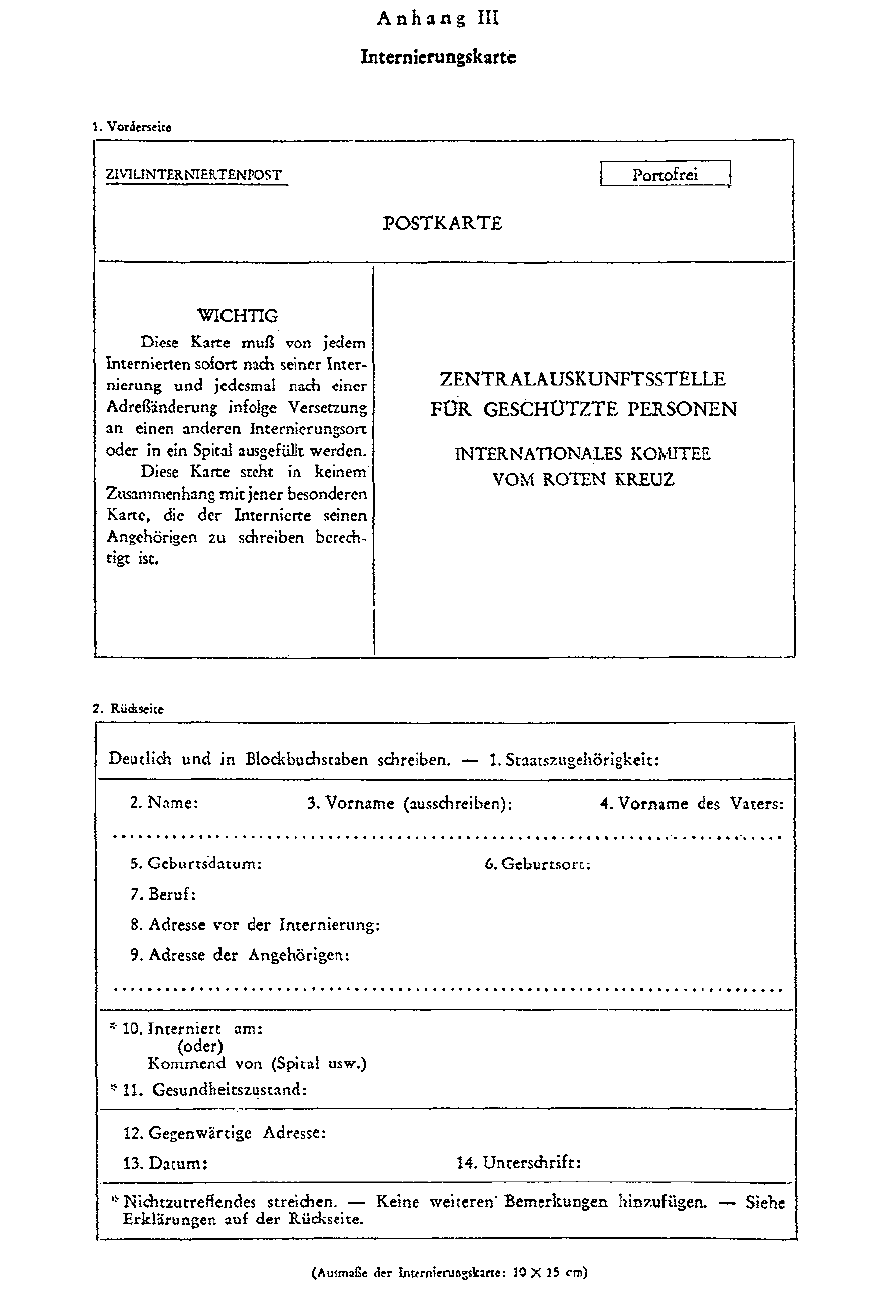 Jede der am Konflikt beteiligten Parteien soll dem genannten Büro in der kürzestmöglichen Frist Mitteilungen über die Maßnahmen übermitteln, die sie gegen jede seit mehr als zwei Wochen festgenommene, einem Zwangsaufenthalt unterworfene oder internierte geschützte Person ergriffen hat. Außerdem soll sie ihre verschiedenen zuständigen Dienststellen beauftragen, dem genannten Büro umgehend Mitteilung über die im Stande dieser Personen eingetretenen Änderungen, wie Überführungen, Freilassungen, Heimschaffungen, Entweichungen, Hospitalisierungen, Geburten und Todesfälle, zu machen.