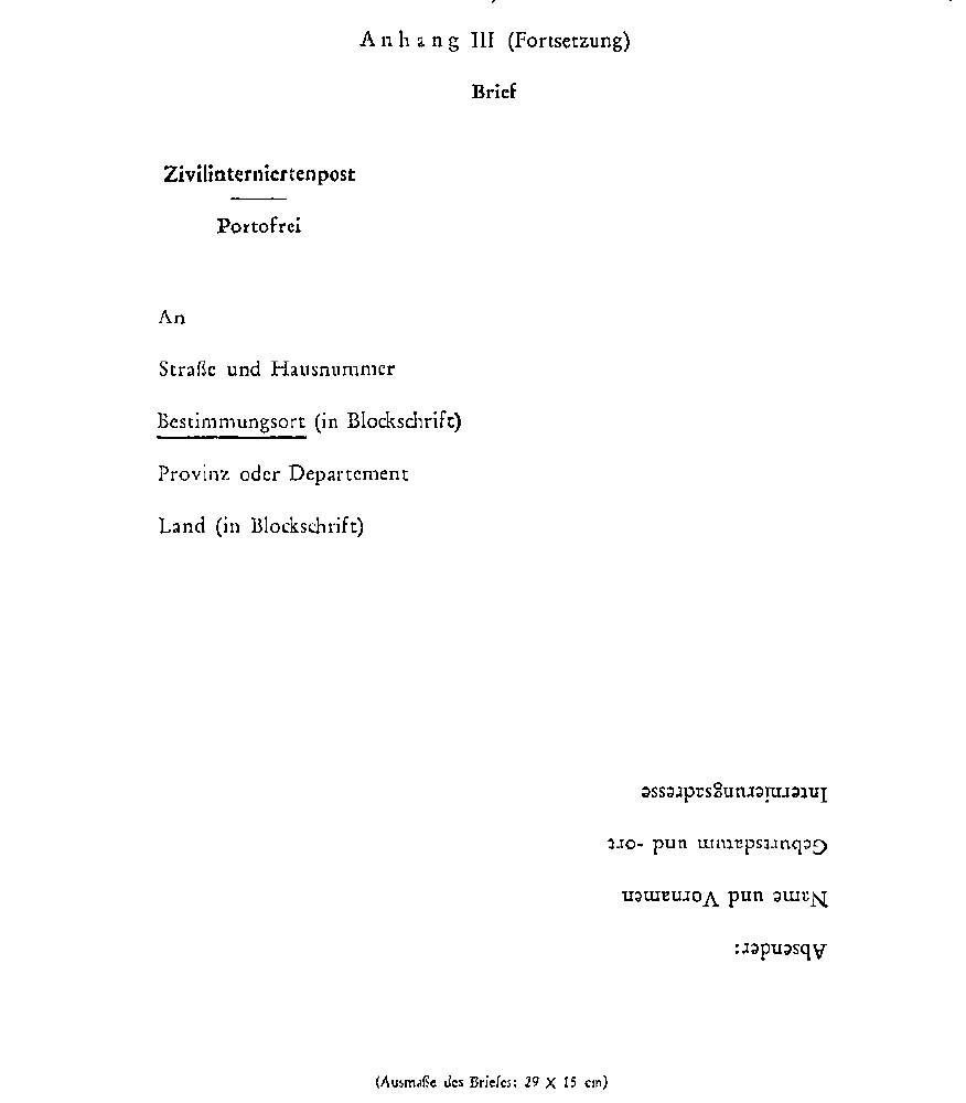 Jede auf dem Gebiete einer am Konflikt beteiligten Partei oder auf einem von ihr besetzten Gebiete befindliche Person soll den Familienmitgliedern, wo immer sie sich befinden, Nachrichten streng persönlicher Natur geben und von ihnen erhalten können. Diese Briefschaften sind rasch und ohne ungerechtfertigte Verzögerung zu befördern.
