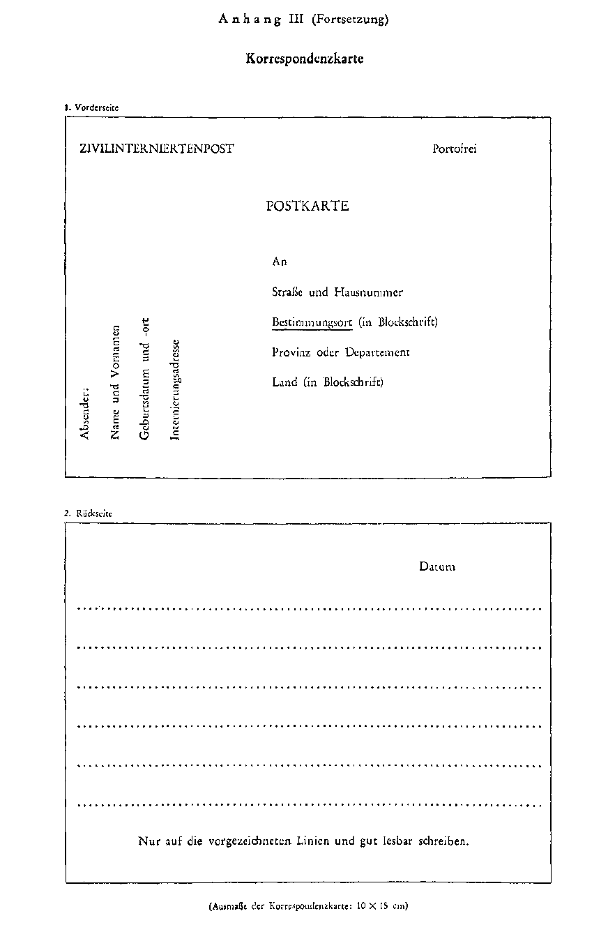 Wenn die am Konflikt beteiligten Parteien es für nötig erachten, diese Familienkorrespondenz einzuschränken, können sie höchstens die Anwendung von einheitlichen Formularen vorschreiben, die 25 frei gewählte Wörter enthalten, und den Gebrauch dieser Formulare auf eine einmalige Sendung im Monat begrenzen.