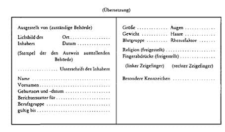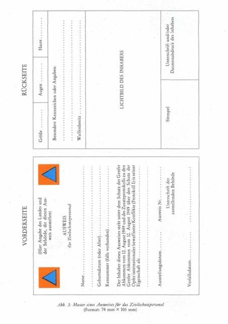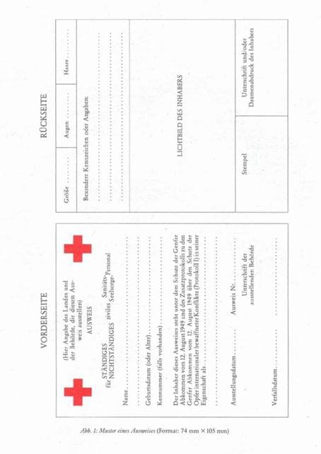 (2) Der Ausweis ist im gesamten Hoheitsgebiet jeder Vertragspartei einheitlich und für alle am Konflikt beteiligten Parteien soweit wie möglich gleichartig. Die am Konflikt beteiligten Parteien können sich an das einsprachige Muster in Abbildung 1 halten. Bei Beginn der Feindseligkeiten übermitteln sie einander ein Exemplar des von ihnen verwendeten Ausweises, wenn dieser von dem Muster in Abbildung 1 abweicht. Der Ausweis wird nach Möglichkeit in zwei Exemplaren ausgefertigt, von denen eines von der ausstellenden Behörde aufbewahrt wird; diese soll für die Kontrolle der von ihr ausgestellten Ausweise sorgen.