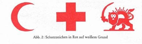 (1) Das Schutzzeichen (rot auf weißem Grund) muß eine den Umständen angemessene Größe besitzen. Bezüglich der Form des Kreuzes, des Halbmonds oder des Löwen mit Sonne können sich die Hohen Vertragsparteien an die Muster in Abbildung 2 halten.