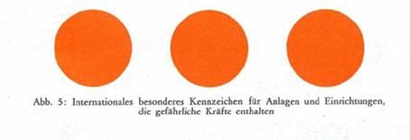 (1) Das in Artikel 56 Absatz 7 des Protokolls vorgesehene internationale besondere Kennzeichen für Anlagen und Einrichtungen, die gefährliche Kräfte enthalten, besteht aus einer Gruppe von drei gleich großen, in einer Linie angeordneten, leuchtend orangefarbenen Kreisen, wobei gemäß Abbildung 5 der Abstand zwischen den Kreisen dem Radius entspricht.