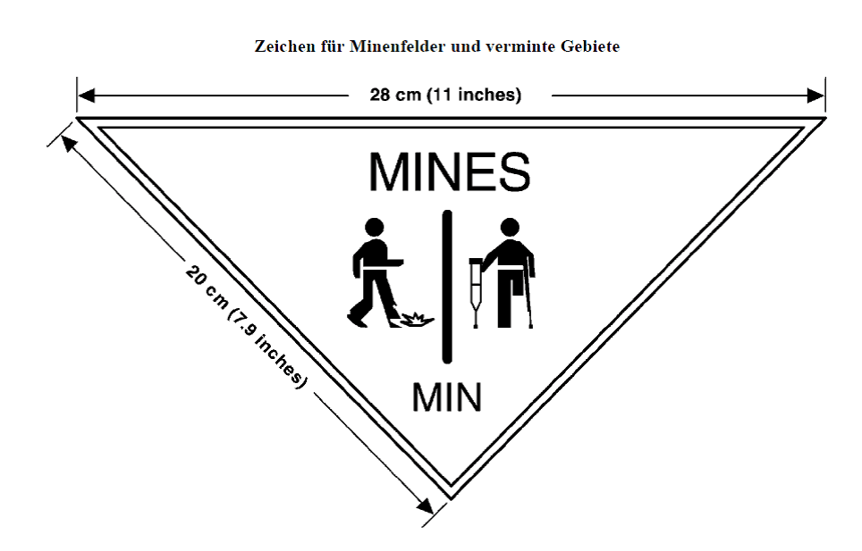 4. Internationale Zeichen für Minenfelder und verminte Gebiete Zur Kennzeichnung von Minenfeldern und verminten Gebieten sind Zeichen ähnlich dem beigefügten Beispiel und wie nachstehend ausgeführt zu verwenden, um sicherzustellen, daß sie gut sichtbar und für die Zivilbevölkerung deutlich erkennbar sind: