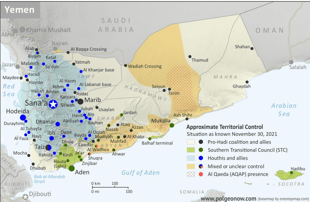 Centanni, Evan; DjukiDjordje (11.2021): Karte basierend auf Koen Adams’s Karte auf onestopmap.com. In: Political Geography Now (PolGeoNow) (1.12.2021): Yemen Control Map Report: Hadi Forces, Leave Hodeida – November 2021, https://www.polgeonow.com/2021/12/yemen-houthis-sieze-hodeida-map.html, Zugriff 15.12.2021