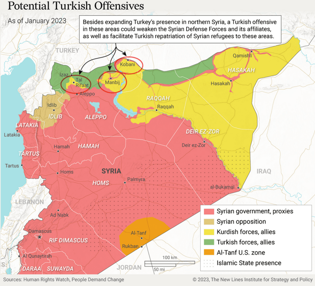 Kurdistan 24 berichtet im August 2023, dass Berichten zufolge ein Militärposten der syrischen Regierung in der Nähe von Manbij von einer türkischen Drohne angegriffen worden sei (Kurdistan24, 13. August 2023).