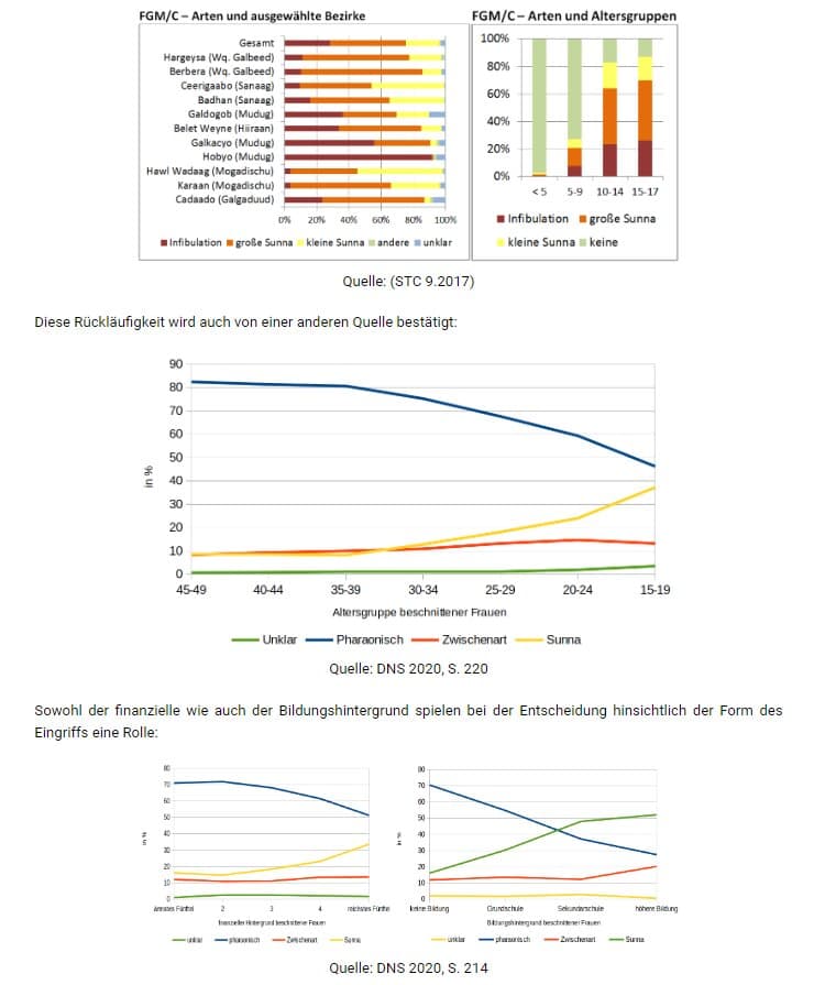 Schon 1985 hat ein Trend eingesetzt, mit dem sich die Sunna nunmehr zur üblichsten Form der Beschneidung entwickeln konnte (FIS 5.10.2018, S. 30f). Obwohl es sich bei der Infibulation immer noch um das am weitesten verbreitete Verfahren handelt, ist der Anteil der Mädchen, die infibuliert werden, in letzter Zeit zugunsten weniger umfangreicher Verfahren - etwa der Sunna - zurückgegangen. Letztere trifft auf gestiegene gesellschaftliche Akzeptanz (LI 14.9.2022). So werden in Mogadischu junge Mädchen nicht mehr der Infibulation, sondern hauptsächlich der Sunna ausgesetzt (Crawford 2015, S. 70). Gemäß Zahlen einer Studie aus dem Jahr 2017 ist in Mogadischu kaum ein unter 18-Jähriges Mädchen infibuliert; dagegen kommen sowohl große als auch kleine Sunna breitflächig zur Anwendung. Insgesamt waren bei dieser Studie rund ein Viertel der beschnittenen Unter-18-Jährigen von Infibulation, die große Mehrheit von kleiner und großer Sunna betroffen. Die Infibulation ist also insgesamt zurückgedrängt worden (STC 9.2017), dies wird von mehreren Quellen bestätigt (LIFOS 16.4.2019, S. 14f/39; vgl. DIS 1.2016, S. 7; FIS 5.10.2018, S. 30f; PC 1.2018, S. 22ff; BMC Yussuf 2020, S. 1f). Außerdem sprachen sich in einer Umfrage aus dem Jahr 2017 42,6 % gegen die Tradition von FGM aus (AV 2017, S. 19). Allerdings gaben nur 15,7 % an, dass in ihrer Gemeinde („community“) FGM nicht durchgeführt wird (AV 2017, S. 25). Bei einer Studie im Jahr 2015 wendete sich die Mehrheit der Befragten gegen die Fortführung der Infibulation, während es kaum Unterstützung für eine völlige Abschaffung von FGM gab (CEDOCA 9.6.2016, S. 7). Die Unterstützung für FGM/C ist jedenfalls gesunken (BMC Yussuf 2020, S. 2). Zum Beispiel wurden in Cadaado (Mudug) im November 2020 nur noch 28 von 278 Eingriffen als Infibulation ausgeführt, im Dezember waren es 22 von 222. Dahingegen sind es Anfang 2019 noch über 200 Infibulationen pro Monat gewesen. Auch hier hat sich die Sunna durchgesetzt (RE 15.2.2021). Bei der Bewertung dieses Trends muss aber berücksichtigt werden, dass in manchen Fällen davon auszugehen ist, dass einfach nur nicht soweit zugenäht wird wie früher; der restliche Eingriff aber de facto einer Infibulation entspricht - und trotzdem von den Betroffenen als "Sunna" bezeichnet wird (Crawford 2015, S. 70).