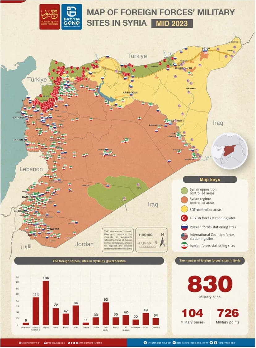 Die folgende Karte zeigt die verschiedenen internationalen Akteure und deren militärische Interessenschwerpunkte in Syrien: