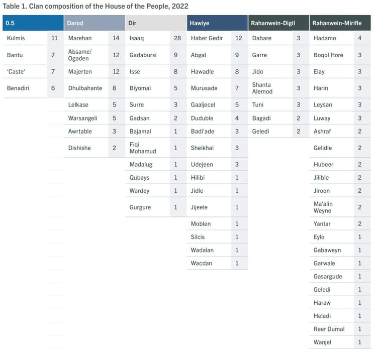 „National/federal legislatures Following the Arta Conference, the 4.5 formula has consistently been applied to the formation of transitional legislatures. Although the exact size of parliament—and therefore the number of seats allocated to each clan—has varied, a 275-seat structure for the HoP has been used since 2012, with a new 54-seat Upper House established in 2016/17 (which does not follow the 4.5 principle, but still loosely follows the principles of clan-based power-sharing). Since 2016, the establishment of the FMSs has meant each parliamentary seat is allocated to an FMS as well as a clan. A document released by the Office of the President in October 2020 setting out the procedures for implementing the September 2020 electoral agreement between the FGS and FMS leaders provides one of the few formal documents outlining parliament’s current intraclan family composition. Using this and other official records, including a public database established by the Office of the Prime Minister listing contested HoP seats, it is possible to extrapolate a breakdown of seats by clan (see Table 1).“