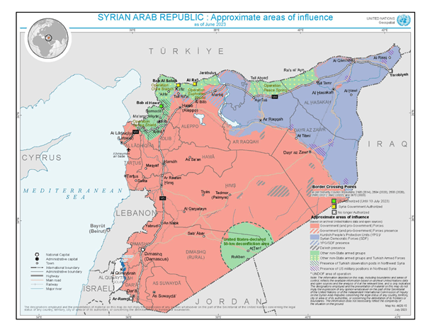 Die militärische Landkarte Syriens hat sich nicht substantiell verändert. Das Regime kontrolliert weiterhin rund 60 Prozent des syrischen Staatsgebiets, mit Ausnahme von Teilen des Nordwestens, des Nordens und des Nordostens (AA 2.2.2024). United Nations Geospatial veröffentlichte eine Karte mit Stand Juni 2023, in welcher die wichtigsten militärischen Akteure und ihre Einflussgebiete verzeichnet sind (UNGeo 1.7.2023):