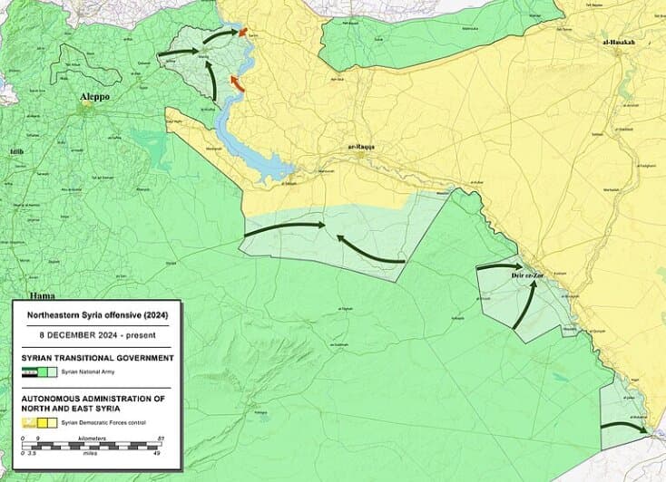 Die von der Türkei unterstützten Rebellengruppierungen unter dem Namen Syrian National Army (SNA) im Norden Syriens starteten eine eigene Operation gegen die von den Kurden geführten Syrian Democratic Forces (SDF) im Norden von Aleppo (BBC 8.12.2024). Im Zuge der Operation „Morgenröte der Freiheit“ (auf Arabisch فجر الحرية - Fajr al-Hurriya) nahmen diese Gruppierungen am 9.12.2024 die Stadt Manbij ein (SOHR 9.12.2024). Die Kampfhandlungen zwischen Einheiten der durch die Türkei unterstützten Syrian National Army (SNA) auf der einen Seite und den SDF auf der anderen Seite dauerten danach weiter an. Türkische Drohnen unterstützten dabei die Truppen am Boden durch Luftangriffe (SOHR 9.12.2024b). [...]