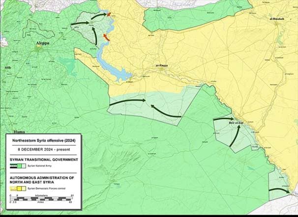 Die von der Türkei unterstützten Rebellengruppierungen unter dem Namen Syrian National Army (SNA) im Norden Syriens starteten eine eigene Operation gegen die von den Kurden geführten Syrian Democratic Forces (SDF) im Norden von Aleppo (BBC 8.12.2024). Im Zuge der Operation „Morgenröte der Freiheit“ (auf Arabisch فجر الحرية - Fajr al-Hurriya) nahmen diese Gruppierungen am 9.12.2024 die Stadt Manbij ein (SOHR 9.12.2024). Die Kampfhandlungen zwischen Einheiten der durch die Türkei unterstützten Syrian National Army (SNA) auf der einen Seite und den SDF auf der anderen Seite dauerten danach weiter an. Türkische Drohnen unterstützten dabei die Truppen am Boden durch Luftangriffe (SOHR 9.12.2024b). [...]