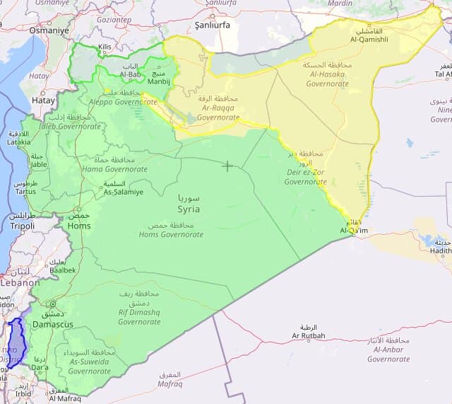 Die HTS und ihre Koalition beherrscht die Gouvernements Latakia, Tartus, Rif Dmashq Homs, Damaskus, Teile von Idlib, Aleppo und Deir ez Zor sowie von Daraa. Nicht von der HTS und ihrer Koalition beherrscht wird das Gouvernements AS Suwayda. Dieses Gouvernement steht unter Kontrolle der lokalen Machthaber. Die Gouvernements Al Hasakah, Deir ez-Zor und Ar-Raqqa stehen teilweise unter der Kontrolle kurdischer Kräfte, im Norden zur türkischen Grenze hin kontrollieren türkische Kräfte und ihre Verbündeten Gebiete um Afrin, in den (Sub-)Distrikten Akhtarin, al-Bab, Ghandoura und Jarbulus sowie in den Subdistrikten Tell-Abyad, Ras Al-Ayn. Im Südwesten zu den Golan Höhen hin, kontrolliert Israel einen Landstreifen.