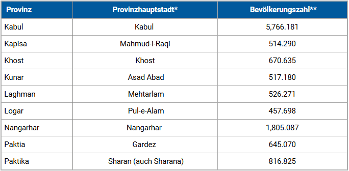 Nangarhar: Achin, Bati Kot, Behsud, Chaparhar, Dara-e-Nur, Deh Bala (auch Haska Mena), Dur Baba, Goshta, Hesarak, Jalalabad, Kama, Khugyani, Kot, Kuzkunar, Lalpoor, Muhmand Dara, Nazyan, Pachiragam, Rodat, Sher Zad, Shinwar, Surkh Rud