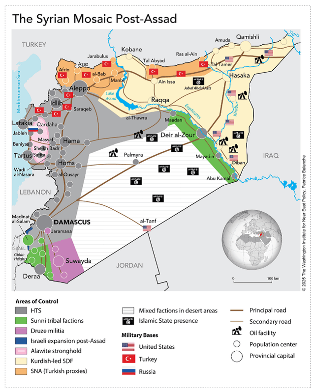 Die Karte zeigt die Aufteilung Syriens unter den bewaffneten Gruppierungen Ende Februar 2025:
