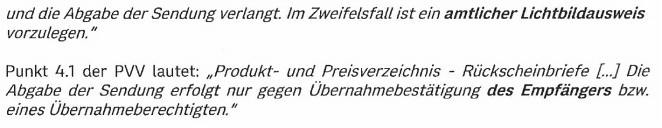 § 3 Z 12 PMG normiert die Notwendigkeit der Bestätigung der Entgegennahme bzw. Aushändigung der Sendung . Über die bloße Ermittlung, sprich die darüberhinausgehende Erfassung oder Speicherung von personenbezogenen (Ausweis-)Daten trifft § 3 Z 12 PMG hingegen keine Aussage. Dies gilt gleichermaßen für § 20 Abs. 1 PMG, der lediglich die Verfassung Allgemeiner Geschäftsbedingungen, jedoch keine rechtliche Verpflichtung zur Verarbeitung personenbezogener Daten normiert.