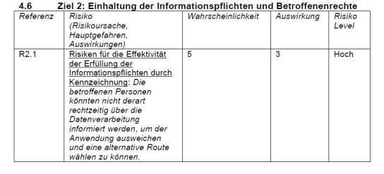 1. Die Verantwortliche führt aus, dass ein hohes Risiko in Bezug auf die Erteilung der zuverlässigen Information an die betroffenen Personen über die Datenverarbeitung dahingehend gegeben ist, dass die betroffenen Personen von der Datenverarbeitung in Form einer Videoüberwachung in ihrem privaten oder beruflichen Lebensbereich erfasst werden, ohne über die Tatsache der Verarbeitung und/oder die Identität des Verantwortlichen informiert zu sein. Konkret definiert die Verantwortliche das Risiko im Rahmen ihrer Datenschutz-Folgenabschätzung als „ Risik[o] für die Effektivität der Erfüllung der Informationspflichten durch Kennzeichnung “. Es handelt sich hierbei – in Hinblick auf die zuvor festgehaltenen Überlegungen – um ein „ Risiko “ iSd Art. 35 DSGVO.
