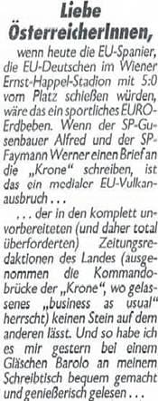 Im vorliegenden Fall war die beanstandete Aussage Teil einer Debatte über Form und Inhalt einer Aussage des Bundeskanzlers und des SPÖ Vorsitzenden zu grundlegenden Fragen der Europapolitik. Zwar brachte die Glosse der Beklagten diese Debatte auf eine andere Ebene, weil sie der flächendeckend geübten Kritik andere als politische Gründe unterstellte, nämlich Überforderung und (implizit) den Neid, selbst keinen vergleichbaren Brief bekommen zu haben. Das Hinterfragen der Gründe politischer Kritik ist aber selbstverständlich ebenfalls Teil der politischen Debatte. Damit steht auch Art 10 EMRK dem vom Berufungsgericht erlassenen Verbot entgegen.