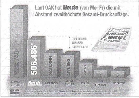 In der Zeitung der Beklagten vom 25. 2. 2010 erschien die im Anhang dieser Entscheidung abgebildete Grafik. Die Österreichische Auflagenkontrolle (ÖAK) weist für „Heute“ für das zweite Halbjahr 2009 eine Druckauflage von 506.486 Stück, für das gesamte Jahr 2009 von 494.629 Stück aus. Die Reichenweitenzahl von 680.000 Lesern ergibt sich aus dem Jahresbericht der Media Analyse 08/09 für die Monate Juni 2008 bis Juli 2009. Dieser Zahl liegen für die Bundesländer Wien, Niederösterreich und Oberösterreich unterschiedliche Fallzahlen und Schwankungsbreiten zugrunde.