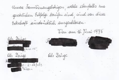 Unter dem Text und den Unterschriften der beiden Ehegatten finden sich insgesamt drei handschriftliche Zusätze „als Zeuge“; zwei davon wurden an den linken Rand der Urkunde untereinander gesetzt und weisen unmittelbar darunter die Unterschrift und die Anschriften von jeweils einer Zeugin auf. Dabei handelt es sich um nunmehr schon verstorbene Schwestern der Ehefrau (die auch schon verstorben ist). Der dritte Zusatz „als Zeuge“ wurde etwa in der Mitte der Urkunde auf gleicher Höhe wie der untere der beiden anderen Zusätze positioniert; er befindet sich damit unterhalb der Unterschrift der Ehegattin des Erblassers, jedoch nicht unmittelbar darunter, sondern in einem Abstand von fast zwei Zentimetern.