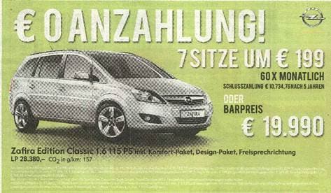 „ Kaufpreis (Barzahlungspreis) € 19.990,00; Leasingentgeltvorauszahlung: € 0,00; kalkulatorischer Restwert: € 10.743,76; km-Leistung p.a. 10.000; Laufzeit: 60 Monate; Vertragszinssatz: 2,99 % p.a.; Gesamtbetrag inkl. Verschiebungszinsen: € 22.896,74; 1. Leasingrate inkl. Verschiebungszinsen und gesetzlicher Vertragsgebühr: € 411,98; Folgeraten p.m.: € 199,00; gesetzliche Vertragsgebühr: € 169,40; Bearbeitungsgebühr: € 208,25; Erhebungsgebühr: € 99,00.