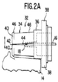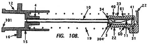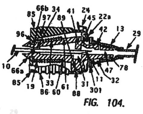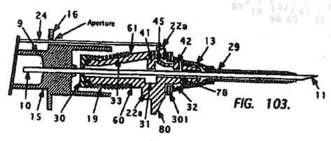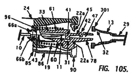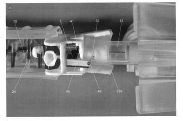 Im Zuge des Erteilungsverfahrens wurde das Kennzeichen des Anspruches insofern präzisiert, als nicht mehr der gesamte Kopplungsmechanismus(g) des Anspruchs 1 als kennzeichnender Teil ausgewiesen wurde, sondern nur mehr das Merkmal, wonach der Vorsprung (42) des distalen Endes des Arms (45) lösbar in einer Ausnehmung (32) des Katheteransatzes (13) gehalten wird. Zu Merkmalen d, e: Eine bevorzugte Ausführungsform der Erfindung im seitlichen Querschnitt ist in den Figuren 103 bis 105 der Patentschrift wie folgt dargestellt: